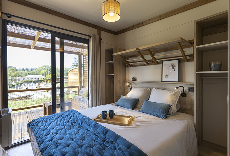 V mobilním domě Chalet naleznete obývací pokoj, se sedací soupravou, stolem se židlemi a návazný kuchyňský kout. V obývací části naleznete také klimatizaci.