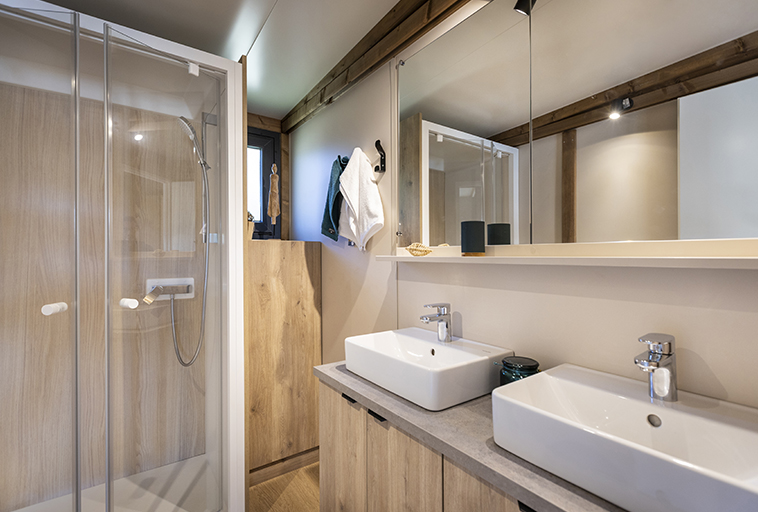 Větší, luxusně vybavený mobilní dům Mobilní dům poskytující pohodlný prostor pro až 5 osob se sanitárním zařízením