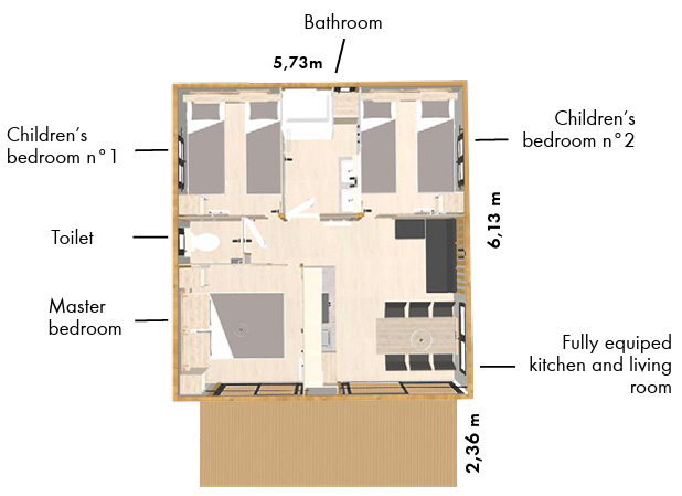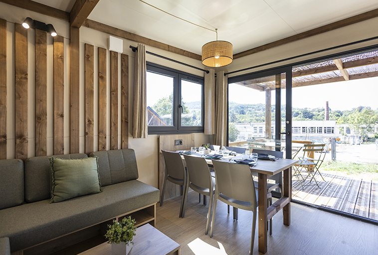 V mobilním domě Chalet naleznete obývací pokoj, se sedací soupravou, stolem se židlemi a návazný kuchyňský kout. V obývací části naleznete také klimatizaci.
